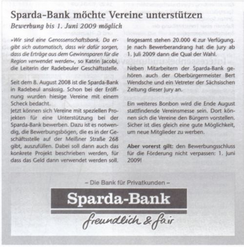 Die Sparda-Bank Radebeul schrieb anläßlich ihres einjährigen Geschäftsjubiläum für Radebeuler Vereine eine Summe von insgesamt 20.000 € aus. Unser Bürgermeister Herr Wendsche übernahm für diese gute soziale Aktion gern die Schirmherrschaft. Auch wir bewarben uns für unsere weiteren Projekte. Die Kommission hatte die Qual der Wahl. Am Samstag war es dann soweit. Viele Vereine bewarben sich um die begehrten Förderungen ihrer Projekte. Es wartete eine faustdicke Überraschung auf uns.