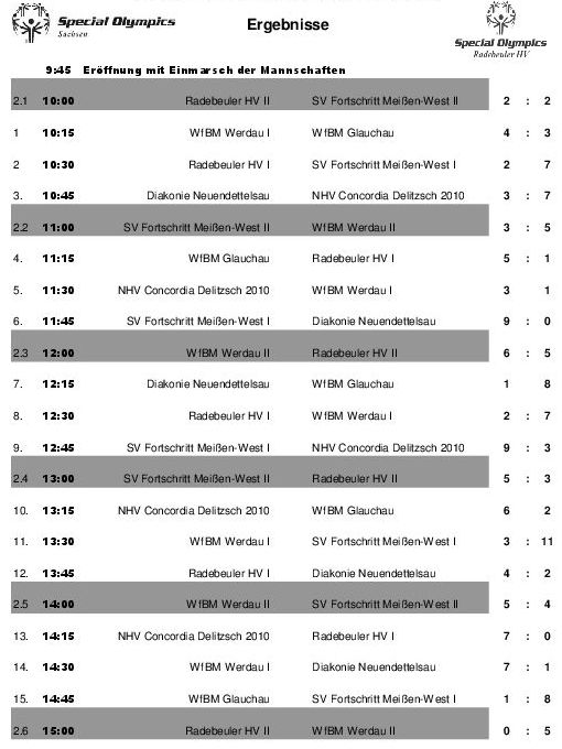 In Zusammenarbeit mit der Schule für geistig behinderte Kinder "Anne-Frank" und der Unterstützung des gesamten Vereins soll es ein erneuter Höhepunkt für unsere Athleten werden. Wir stellen nicht den Anspruch von "Großturnieren" wie die WM, EM oder den Olympischen Spiele sind. Es ist aber ein im Breitensport führendes Turnier. Oft wird dieses als Randerscheinung wahrgenommen, doch dieses hat es in sich. Jedes Turnier, ob im Kinder- und Jugendbereich aber auch bei den Erwachsenen ist nicht mehr mit unerheblichen Kosten zu realisieren. Es geht aber auch anders. Unsere am weitesten angereisten Gäste zahlen für die Übernachtung mit Abendbrot und Frühstücke wenige €uro pro Person! Dafür braucht es aber auch einer selbstlosen Hilfe vieler ehrenamtlicher Helfer. Die Räumlichkeiten für die Übernachtung werden von der "Freien evangelischen Gemeinde" in Radebeul zur Verfügung gestellt. Für das Turnier selbst ist die Liste der Helfer schier unerschöpflich. Zu nennen wären dabei die eigenen Mitglieder des Radebeuler Handballvereins, die neben den Punktspielbetrieb sich für diese gute Sache einsetzen. Ob die Damen der Breitensport- Frauen-, Männer- Jugend- oder Kindermannschaften - die Schiedsrichter und das Kampfgericht - alle sind, wenn sie auch nicht die volle Zeit haben, dabei. Unsere Schule für geistig Behinderte Kinder "Anne Frank" und Eltern komplettieren die breite Front der gemeinnützig Tätigen. Natürlich immer dabei; das Kuchenbuffet, betreut durch unsere Damen Breitensport und die kostenlose Bratwurst für jeden Teilnehmer. Geleitet wird die Versorgung durch das bewährte Team des Sportcasinos Lößnitzhalle. Im Vorfeld bekommt der Vorstand des RHV , die Schulleitung und Special Olympics Sachsen ein dickes Lob für ihre Zuwendung. Dadurch wurde wieder mit wenig finanziellen Aufwand ein Turnier auf die Beine gestellt, das richtungsweisend für die Zukunft aller Turniere dieser Art sein sollte.
