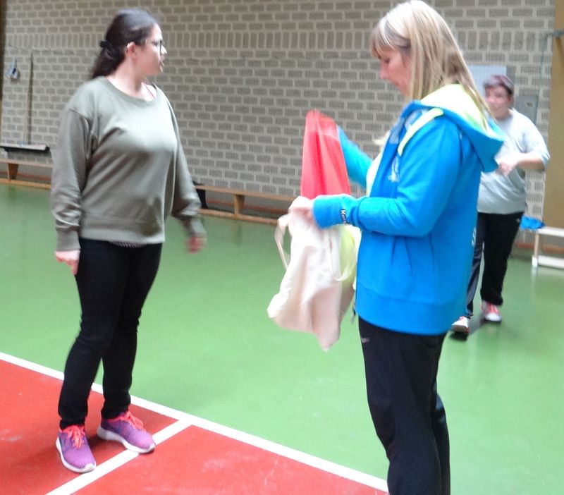 Sandra und Jutta bereiten das Aufwärmen mit einem Mattenball (Ablegeball) vor