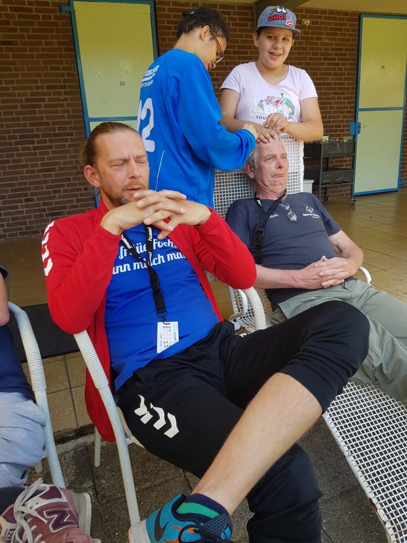 Die Betreuer befleißigen sich am Abend mit Studien zur Gestigsprache. Wieder mal ein sehr konstruktiver Abend mit humorvollem Weiterbildungseffekt. Aber geht auch die Müdigkeit nicht an Erwachsene vorbei. Schlaft gut!