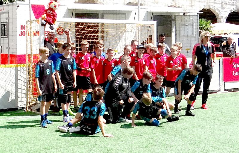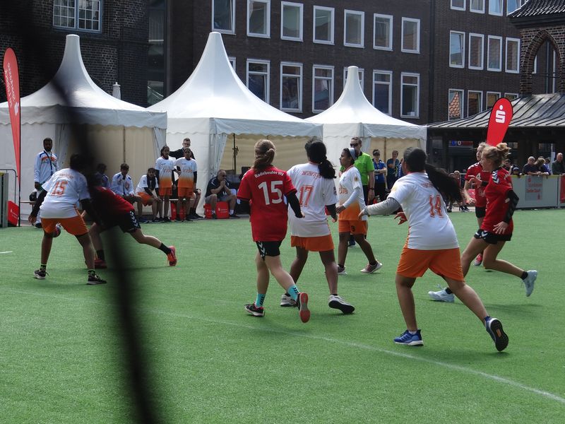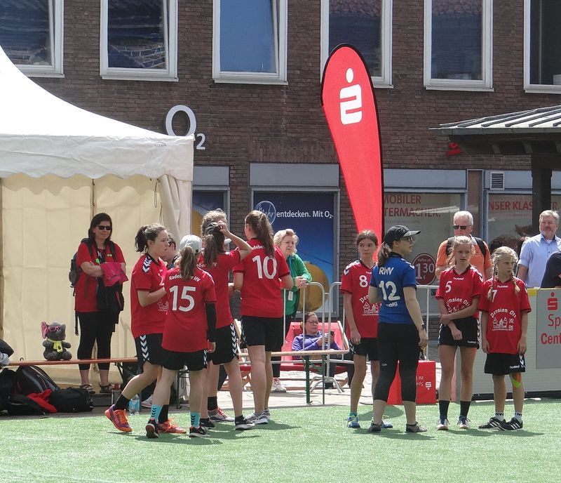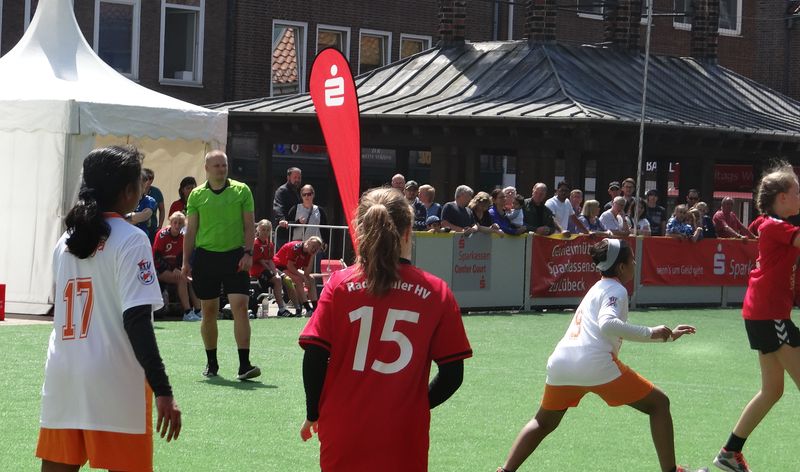 Lange konnten die Mädchen und Jungs nicht bleiben. Wieder hatten sie Pech und mußten sich sputen das Spielfeld am Rathaus in der Stadtmitte zu erreichen. Das SO Team hatte diesmal mehr Glück und erreichte den Sparkassen-Center-Court mitten in der Begegnung unsere Jugend D gegen Kauno raj SM - Garliava aus Litauen. Unter unseren Anfeuerrufen gewannen sie 10:8. Ein toller Einstand! Gleich darauf sind die Mädels an der Reihe.