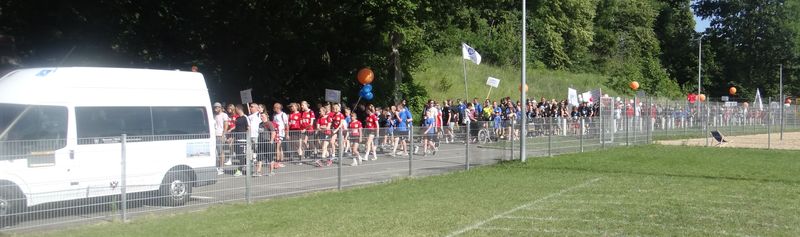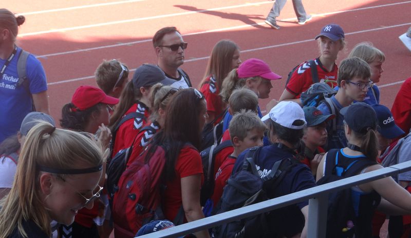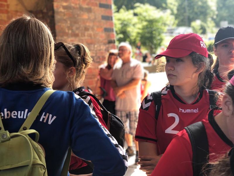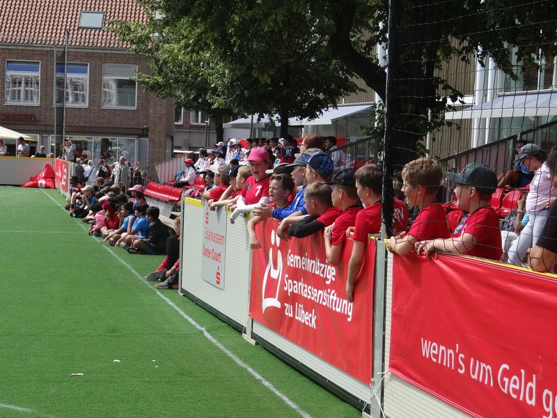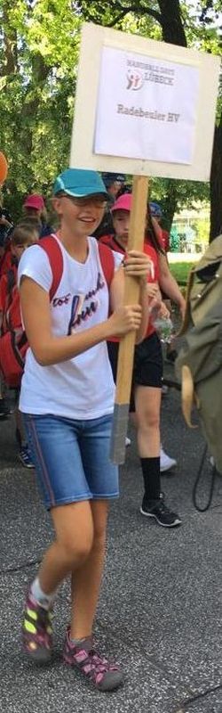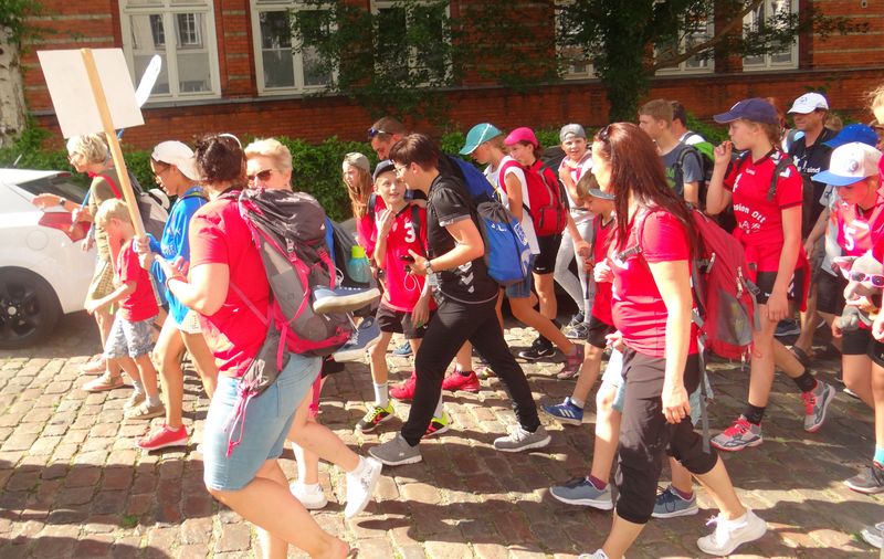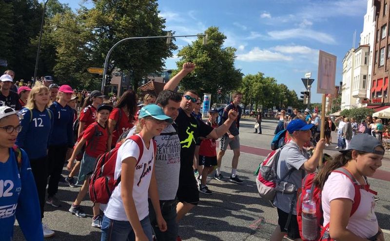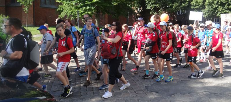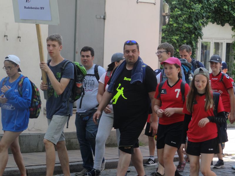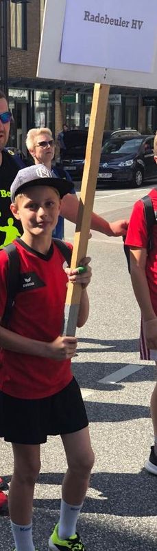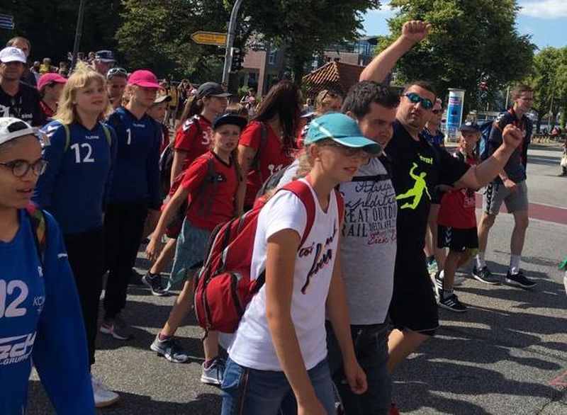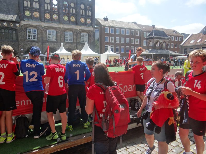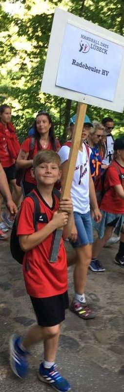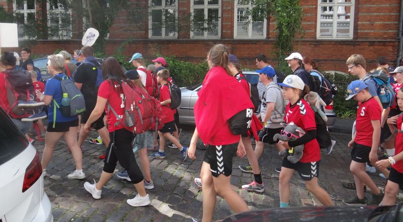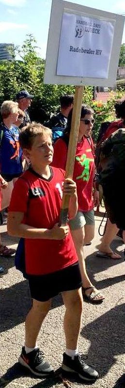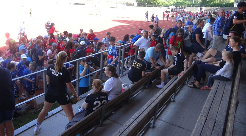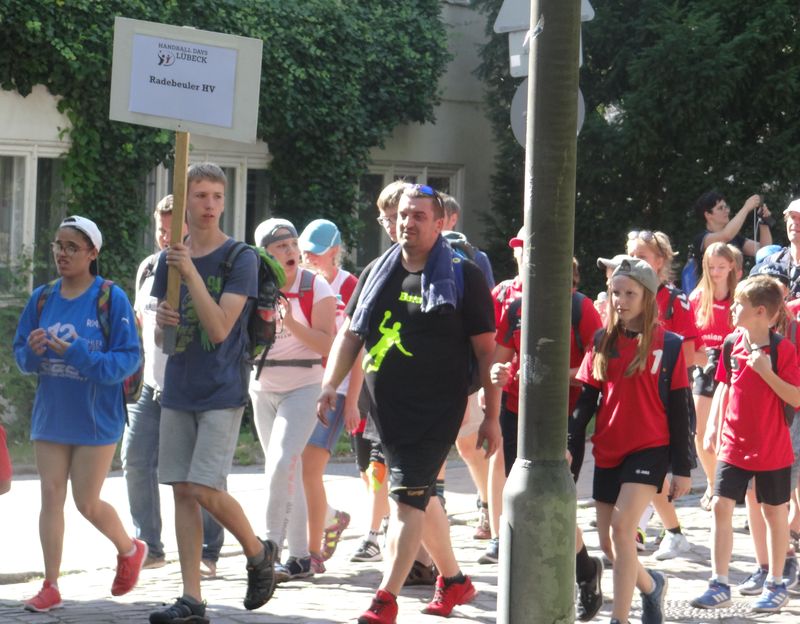 Die große Parade durch die Stadt wollen wir alle gemeinsam mitmachen. So viele Handballer|innen auf einmal im ganzen zu haben ist schon bemerkenswert. Ich habe schon Welt- und Nationale Spiele beeindruckend erlebt, aber das ist eine neue positive Erfahrung. Mit unseren RHV-Sprechchören marschierten wir durch die Lübecker Straßen. Polizei sperrte unsere Marschroute frei. Autofahrer mußten lange warten bis die schier endlose Schlange an ihnen vorbei war. Im Stadion Buniamshof wurden die Tribünen besetzt.