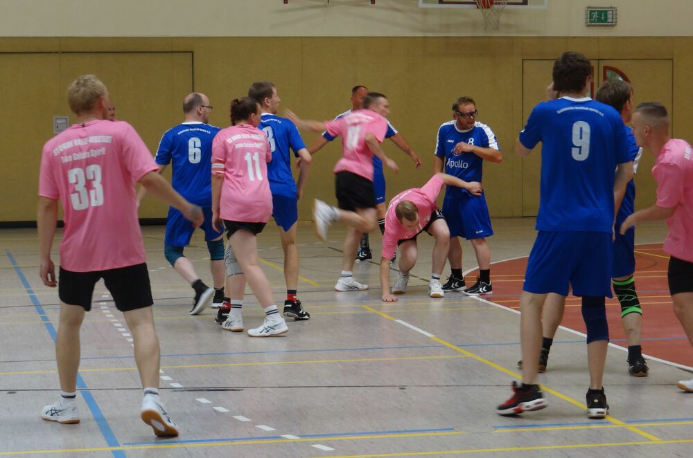 Die 10 Mannschaften laufen voller Erwartungen ein. Hallensprecher Markus setzt sie mit seiner Redegewandtheit ins rechte Licht. Es ist nicht nur unser Radebeuler Turnier. Es ist auch als Anerkennungswettbewerb ausgeschrieben. Dieser Wettbewerb ist gleichzeitig für einige Athletinnen und Athleten als Qualifikation für die im nächsten Jahr stattfindenden Nationalen Spiele Saarland 2026 ausgeschrieben.
